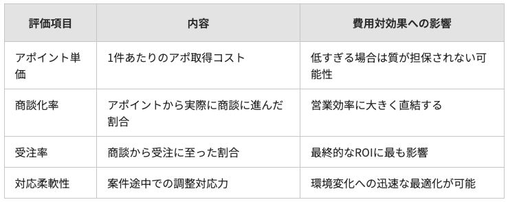 実務上の経験として、成果報酬型では短期間でのアポ獲得数を重視する風潮が見られる一方、月額固定制においては企業ごとの営業戦略に沿った継続的な改善提案が期待できるという違いもあります。つまり、単なるアポ数だけでなく「どんなアポが取れているか」「受注につながる品質があるか」といった観点で考えることが、最終的なROIを高める鍵となるのです。